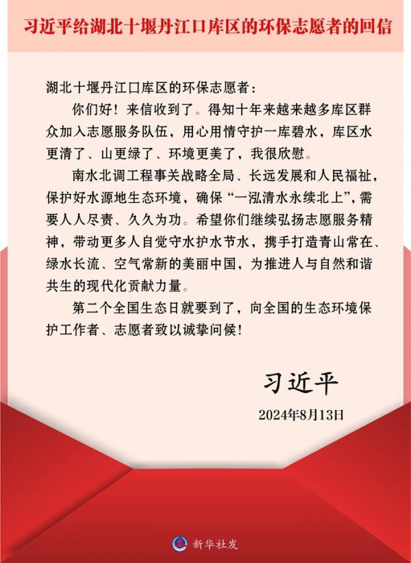 在第二个全国生态日来临之际,中共中央总书记、国家主席、中央军委主席习近平给湖北十堰丹江口库区的环保志愿者回信,对他们予以亲切勉励,并向全国的生态环境保护工作者、志愿者致以诚挚问候。