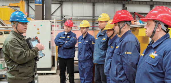 按照这一模式,培训迅速展开。培训课程紧扣企业生产实际,从工业机器人数控编程基础到实操技巧,再到订单定制化的参数调试、常见故障排查。叶永旺和商红志两位老师走进车间,现场授课演示、答疑解惑,确保每名学员都能掌握核心技能。